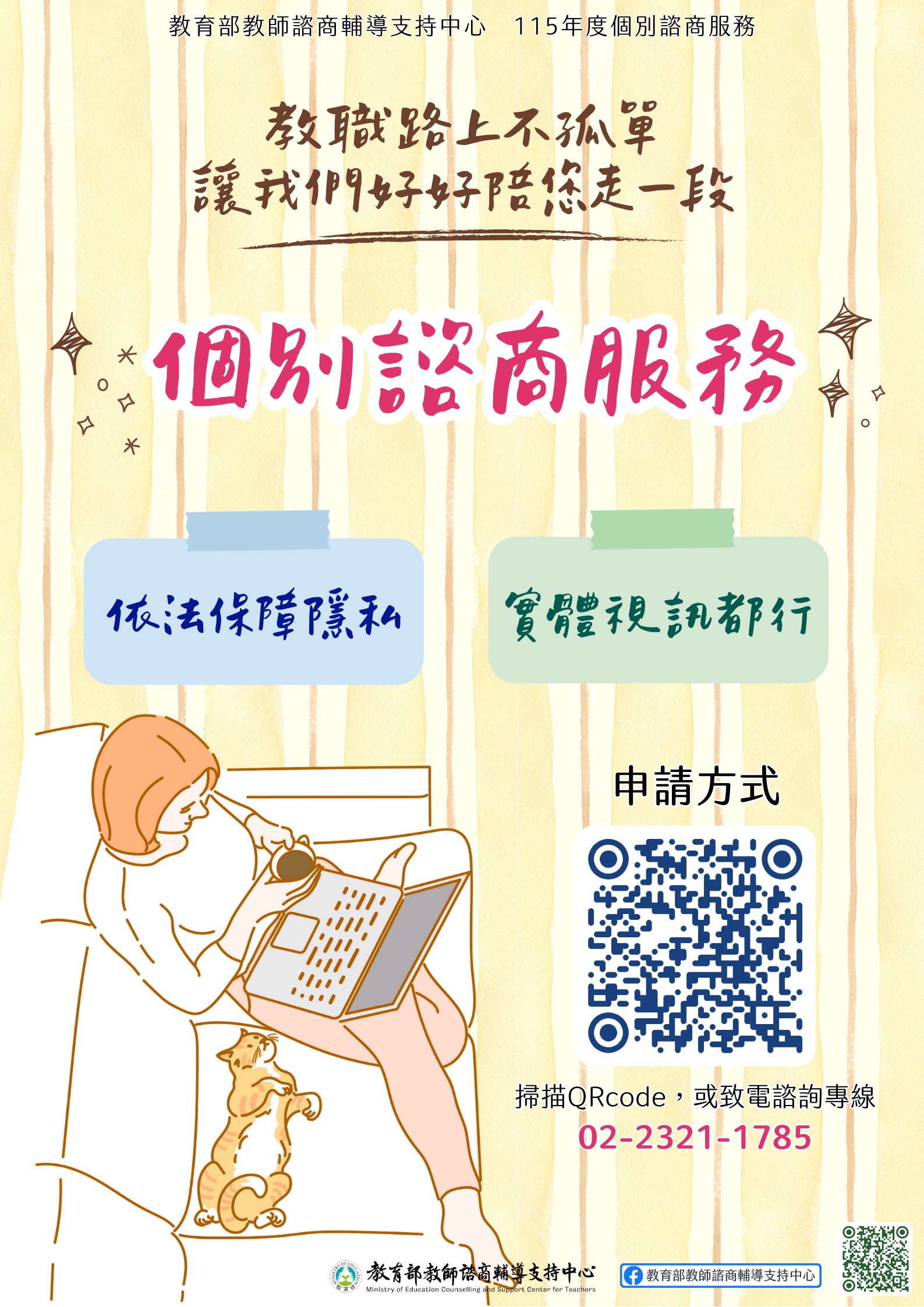 轉知教育部教師諮商輔導支持中心115年度個別諮商輔導服務Post published:2026-03-23Post author:chgshpaPost category:10.人事室教育部教師諮商輔導支持中心115年度個別諮商服務 Post Views: 8Tags: ..行政事務Read more articles上一篇文章國立臺灣藝術大學辦理「115年全國高級中等學校『孝道教育』微電影徵件競賽實施計畫」下一篇文章國立臺灣師範大學「115學年度工業教育學系學士班公費專班單獨招生」相關內容113學年度第2學期代收代辦經費收入明細一覽表2025-04-28教育部國民及學前教育署補助高級中等學校學生校外職場參觀與校外實習及校內併校外實習經費作業要點修正發布2023-01-18修正「國立彰化女子高級中學建置學生學習歷程檔案作業補充規定」,並自即日生效2023-07-28