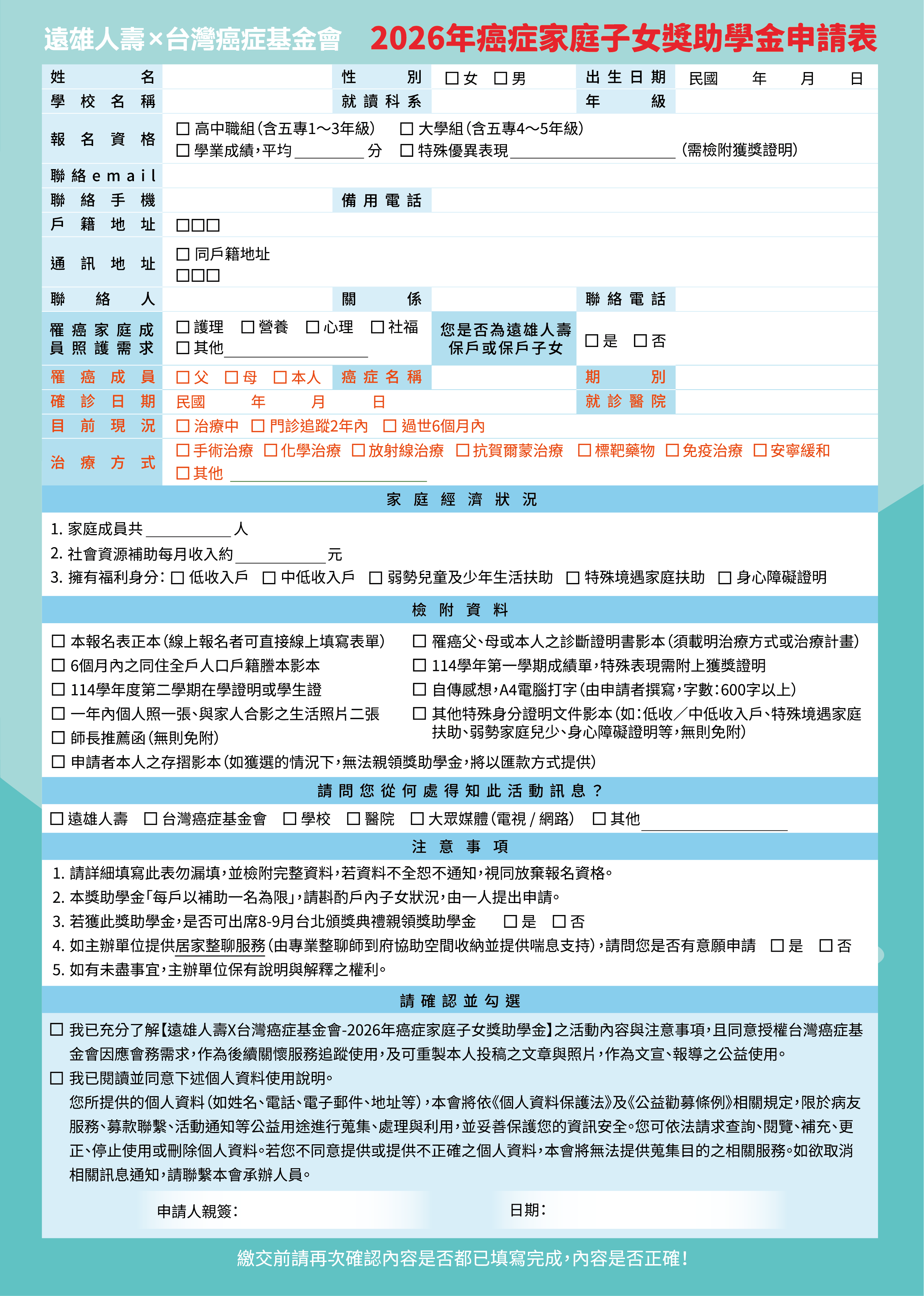 2、郵寄掛號:郵寄掛號:至台灣癌症基金會官網「最新消息」下載申請表,填寫完整連同檢附資料寄至105台北市南京東路五段16號5樓之2,並註明「2026台癌x遠雄人壽-癌症家庭子女獎助學金」 活動小組收」。